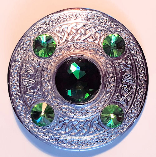 Plaid Broach, Groen geslepen glas in het midden en 4 stukjes groen geslepen glas daar omheen.